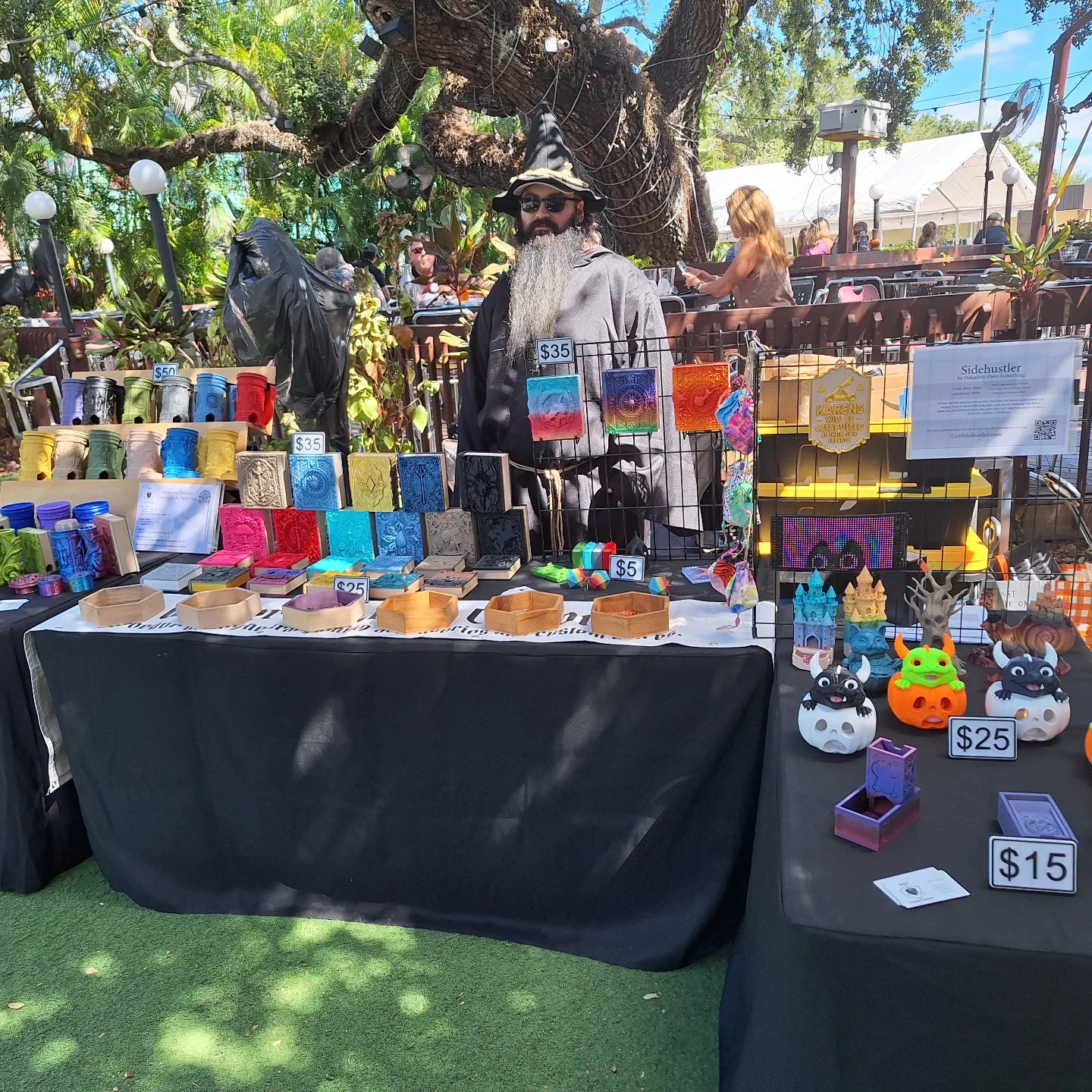 Almost everything you see here started on a workbench in Florida — 3D printed, hand-poured in resin, or cut from wood by Matt. The dice? Those come from two suppliers he actually trusts: Misty Mountain Gaming and DnDDice, brought in so your hoard options stay as wide as your ambitions.