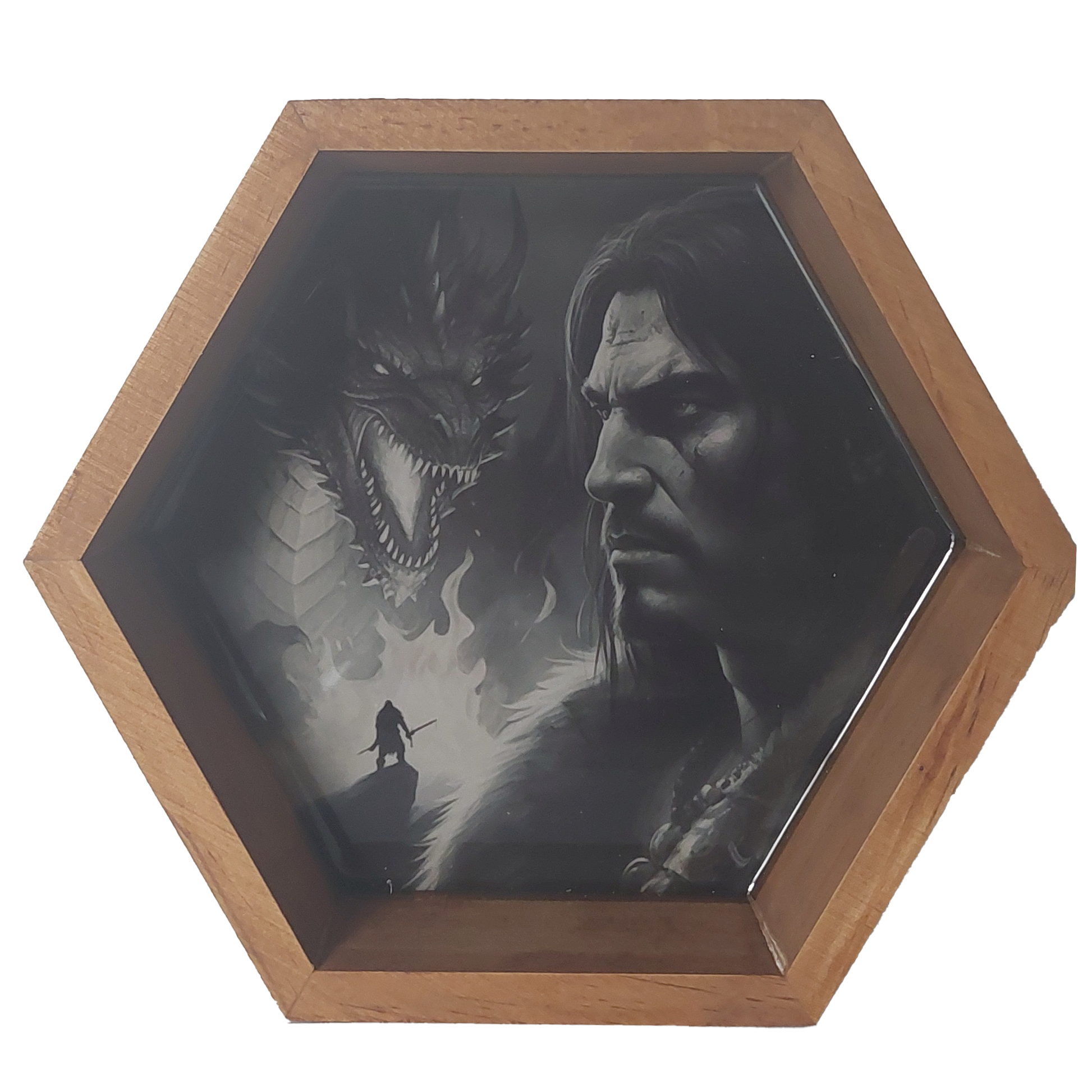 Our 8" hexagonal wooden dice tray features stunning fantasy art captured under a layer of resin. Make your gaming experience even more immersive and visually appealing with this unique and stylish addition to your gaming setup. Each is 2 inches deep, helping to ensure even the feistiest roller can keep their dice where they land. Every roll of the dice will feel like a thrilling adventure with this art dice tray!