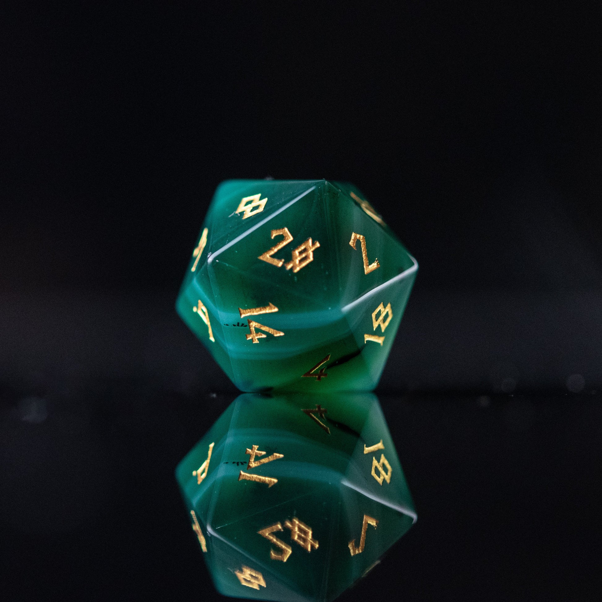This set of green and white dice is breathtaking to hold, and a joy to play with! Possessing patterns that vary wildly from layered, to marbled, to swirling spirals, our green agate dice are sure to be a showstopper at your table!