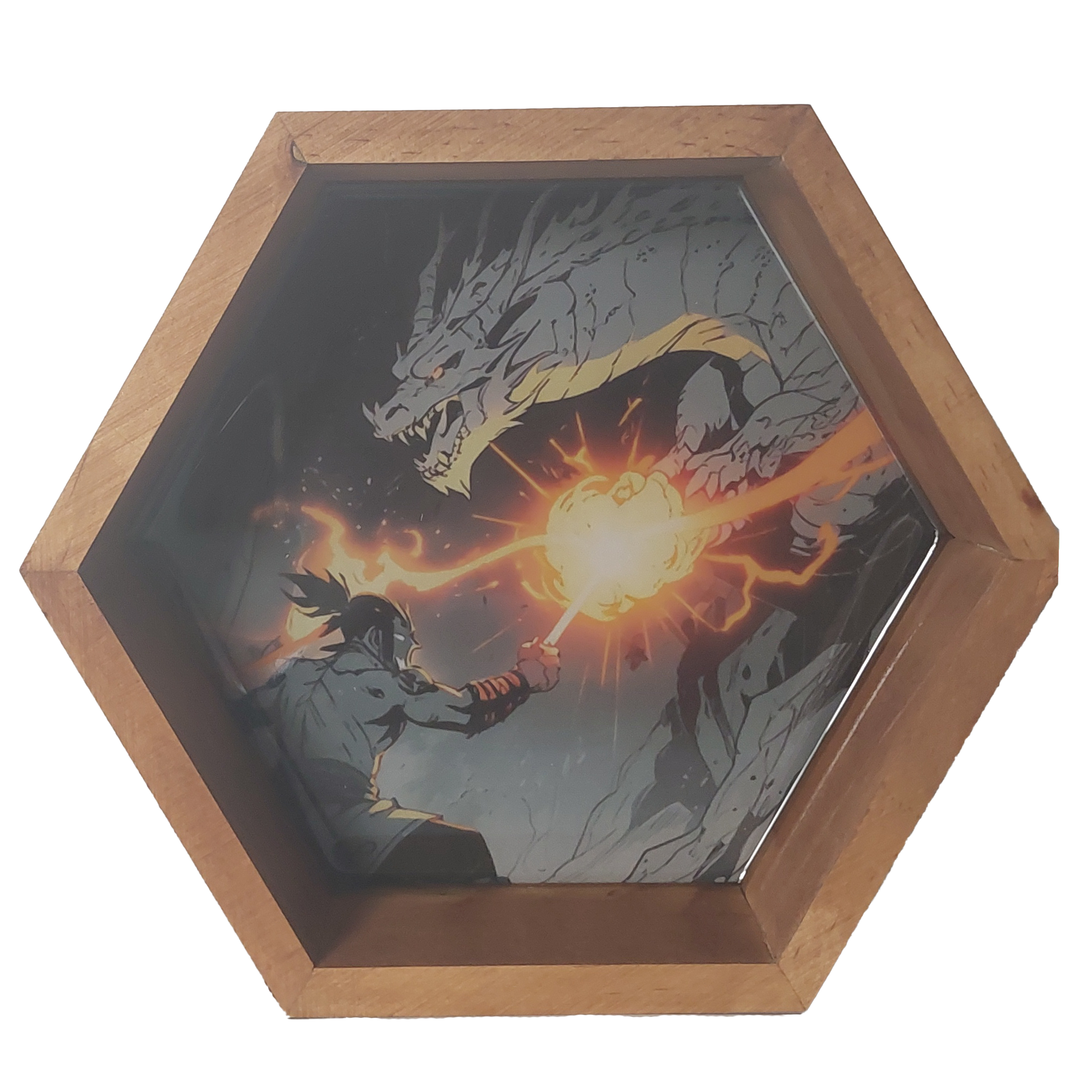 Our 8" hexagonal wooden dice tray features stunning fantasy art captured under a layer of resin. Make your gaming experience even more immersive and visually appealing with this unique and stylish addition to your gaming setup. Each is 2 inches deep, helping to ensure even the feistiest roller can keep their dice where they land. Every roll of the dice will feel like a thrilling adventure with this art dice tray!