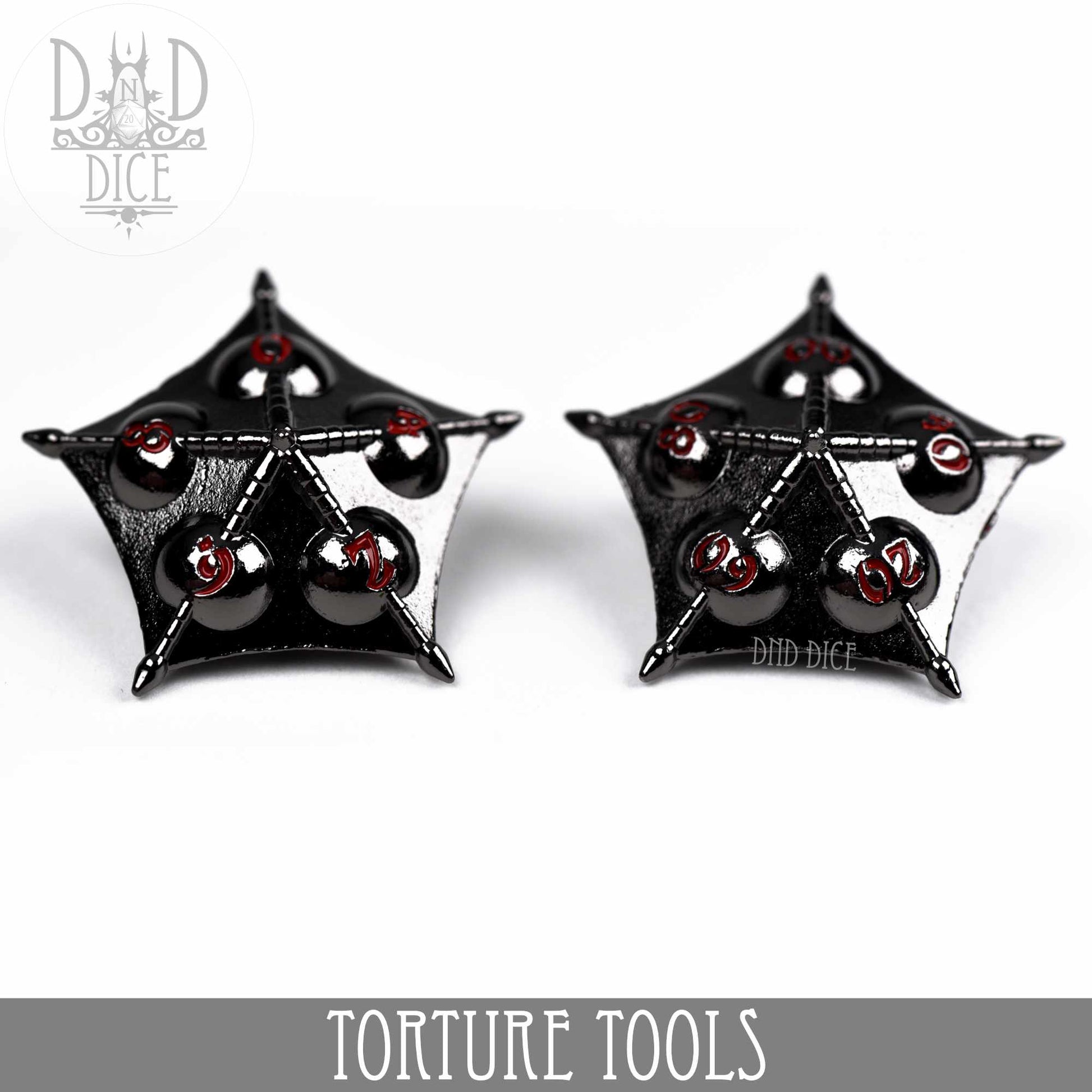 Experience the edge of gaming with the Torture Tools Red - Metal Dice Set, designed for those who dare to roll differently. This set includes seven precision-crafted dice: a 30mm D4, 28mm D6, 30mm D8, 33mm D10, 33mm percentile die, 38mm D12, and a 29mm D20, each made from sturdy zinc alloy for a solid, weighty feel. One die boldly stands out with a unique color, adding character to your roll. These sharp-edged dice can spin or roll for dynamic gameplay but require care to protect your table surface. Elevate your game with style and intensity using these striking metal dice.